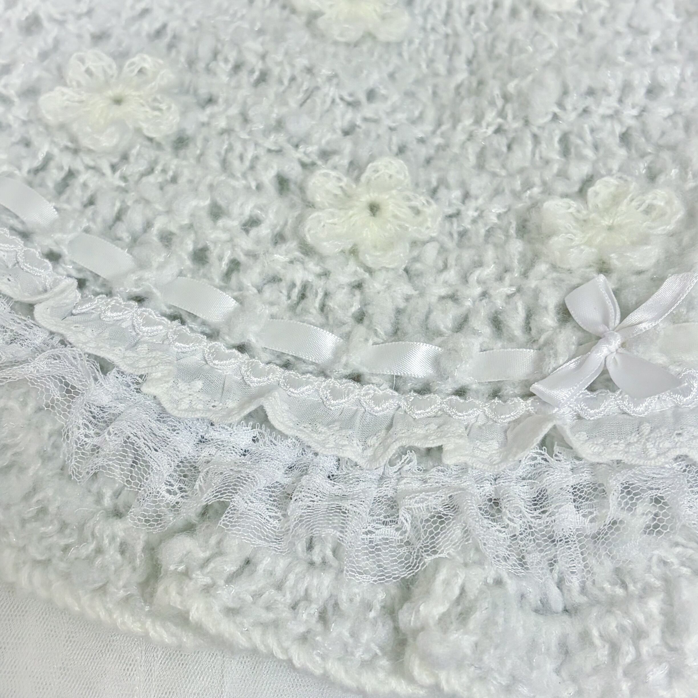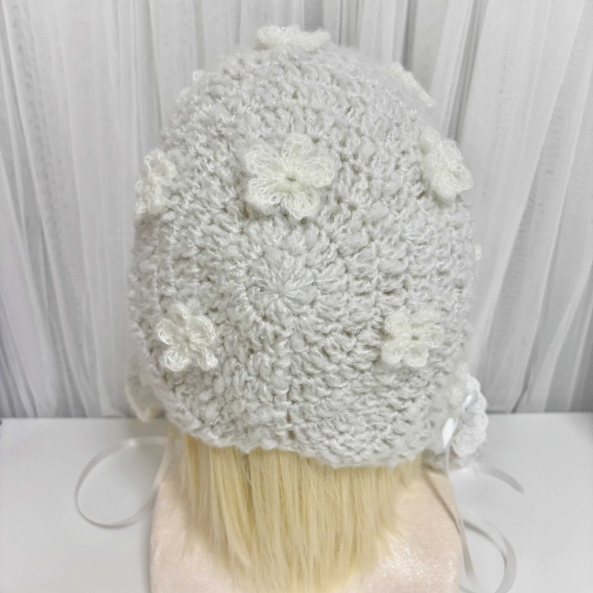 ふわふわの毛糸でフリルたっぷりに編み上げた、やさしい夢の中のようなお花たっぷりボンネット。